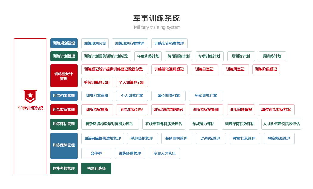 部隊管理系統 機關辦公系統 軍事教育系統 智慧政工系統 軍事訓練系統 后勤保障系統 智慧安防系統 裝備管理系統